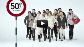 Lo spot tv da 15”, sempre con la regia di Leo Solanes, presenta in modo spiritoso la corsa al bollino rosso: tantissimi modelli con indosso la nuova collezione corrono felici verso un segnale del 50% appunto. Perché gli sconti si sa, mettono di buonumore.