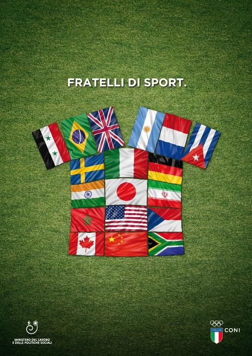 Simboli dell'operazione una maglietta da calcio composta da tante bandiere e il claim: Fratelli di sport.