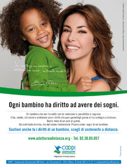 'Io sostengo un bambino a distanza con COOPI. Sostienilo anche tu', afferma Emanuela, che si batte a fianco di COOPI per supportare il sostegno a distanza nella campagna che l’associazione lancia da novembre 2009 per i prossimi mesi. La campagna si basa su uno scatto fotografico che Emanuela Folliero ha fatto ad hoc; il fotografo è Dario Plozzer. Art director della campagna, declinata offline (stampa) e online (banner), è Nausica Eleonora.