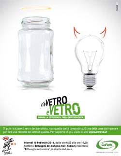 L'annuncio stampa on air dal 4 febbraio su alcune delle principali testate del Nord e, nei prossimi mesi, su altre testate del Centro e del Sud, suggerisce con ironia l'opposto trattamento da riservare in fase di raccolta a due rifiuti in vetro, quali il barattolo e la lampadina. Ha lavorato sotto la direzione creativa e art Daniele Campanale, il copy Alessio Logrippo.