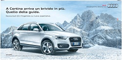 Da inizio gennaio è presente a Cortina una maxiaffissione a lato dell’AudiPalace che ritrae tra le montagne della valle d’Ampezzo la Audi Q3, il nuovo SUV premium in formato compatto della Casa di Ingolstadt. Lo scatto è a cura del fotografo ampezzano Diego Gaspari Bandion.