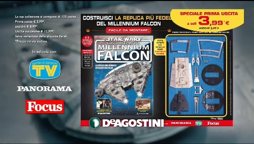 In occasione dell’uscita nei cinema del nuovo capitolo della saga di Star Wars, arriva anche in Italia la nave spaziale più famosa del cinema grazie ad un’ iniziativa realizzata da De Agostini Publishing con il supporto dei magazine Mondadori. Il lancio è sostenuto da una corposa campagna di comunicazione TV, cinema, web e stampa per un periodo complessivo che va dal 24 dicembre 2015 al 17 gennaio 2016. La pianificazione è stata curata da Carat.