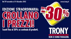 Al via la nuova campagna adv Trony 'Crollano i prezzi fino al -30%', per comunicare le nuove offerte della catena di elettronica.Si parte il 27 novembre su radio, tv e web con una serie di interventi pianificati dal centro media Carat. Tutte le occasioni saranno presentate da Mr. Trony, un personaggio di animazione che accompagna ormai da tempo tutti gli spot della catena per presentare, all’interno dell’edizione straordinaria di un originale TG, dettagli e opportunità di questa iniziativa con sconti su tantissimi prodotti e possibilità di finanziamenti a tasso zero.