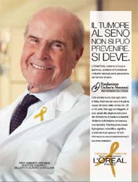 indossando il Nastro Oro L’Oréal Paris. Le due testimonial sono state fotografate da Gianmarco Chieregato, anche lui amico della Fondazione e coinvolto a titolo gratuito.Il soggetto di apertura della campagna stampa ha come protagonista il Prof. Umberto Veronesi. Insieme, per contribuire in modo concreto alla diffusione della prevenzione.