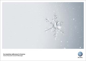 È on air su stampa quotidiana e periodica la nuova campagna firmata da DDB per il Servizio Pneumatici Invernali Volkswagen. L’immagine è quella di un cristallo di neve che, visto al microscopio, racconta una natura molto diversa rispetto a quella che siamo abituati a vedere. Il cristallo è infatti dotato di una piccola ventosa perché, guidando con i pneumatici invernali consigliati da Volkswagen, le strade invernali - e quindi anche il ghiaccio e la neve - sembrano meno scivolose e quindi più sicure da affrontare.Per l'agenzia guidata da Daniele Peccerillo ha lavorato la coppia senior formata dall'art Armando Viale e dal copy Valerio le Moli, con la direzione creativa di Luca Albanese e Francesco Taddeucci. La post produzione è stata realizzata da Dock 75.