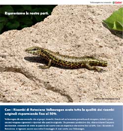 Il soggetto stampa realizzato per Volkswagen Service esemplifica il concetto di rigenerazione proprio della rotazione di pezzi usurati attraverso la metafora della lucertola, notoriamente dotata della 'capacità' naturale di rigenerare la propria coda. La creatività è firmata da Alessandro Campani, art director, e Stefano Guidi, copywriter. Direzione Creativa Esecutiva di Luca Albanese e Francesco Taddeucci.