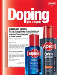 capelli, messa a punto dai laboratori Dr Wolff, che da oltre 100 anni si dedicano allo studio e alla ricerca nel campo della cura dei capelli. Per la creatività Alpecin ritorna in primo piano l’ormai famoso claim “Doping per i capelli”, un adattamento della casa madre tedesca, che, oltre a mostrare i prodotti, spiega, con testi e un grafico di accompagnamento, il meccanismo di azione dello shampoo e della lozione, che, grazie al principio attivo a base di caffeina, stimola e prolunga le fasi di crescita per i soggetti dei capelli.Il valore della campagna media per Alpecin è di oltre 1 mln di euro, mentre quella per Plantur39 è di poco meno di 700 mila euro, per un totale di un milione e settecentomila euro.
