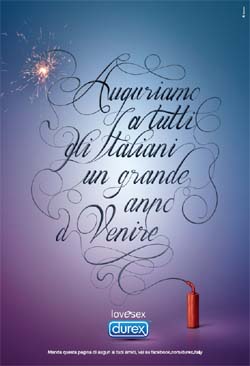 Con un annuncio divertente, Durex accoglie il 2012 pianificando nel periodo di capodanno sui principali quotidiani una campagna realizzata ad hoc da Euro RSCG Milano. I due direttori creativi Lorenzo Crespi e Selmi Bali Barissever, copy ed art, hanno ideato insieme all’art director Filippo Formentini, sotto la direzione creativa esecutiva di Giovanni Porro, una pagina che esprimesse il valore fondante del brand, il sexual wellbeing. Ironia e leggerezza sono le parole chiave che hanno ispirato questi singolari auguri a tutti gli italiani.