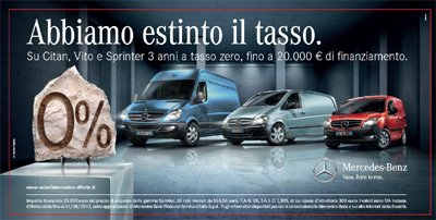 Sono Citan, Vito e Sprinter i protagonisti dell’annuncio, che li vede raffigurati all’interno di un’elegante area espositiva museale dove, su un piedistallo, troneggia un fossile che raffigura una percentuale. Sempre attenta al momento storico e alle esigenze del mercato, Mercedes-Benz non può non vedere il tasso d’interesse come obsoleto ed appartenente ad un’epoca che non esiste più.