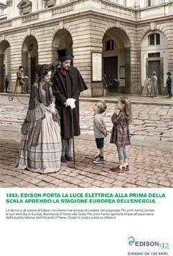 Con la tecnica del “motion control”, lo spot presenta quattro testimonianze di altrettanti periodi di attività di Edison, ognuna delle quali viene raccontata da una coppia di personaggi in un unico piano sequenza, che ha come sfondo sempre la Scala.