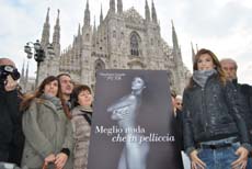 Dopo il successo della presentazione a Los Angeles, la Canalis lunedì 28 novembre è stata a Milano in Piazza Duomo per ricordare agli italiani che non c’è bisogno di indossare capi in pelliccia per proteggersi dal freddo o per essere alla moda. Elisabetta ha dichiarato “Ho deciso di aderire a questa campagna e svestirmi per la PETA perché penso che posare nuda sia un modo per creare attenzione sulla causa. Non ci si deve dimenticare che dietro ad una pelliccia si nasconde tanta brutalità: ogni anno milioni di animali vengono barbaramente uccisi scuoiati vivi, fatti annegare, folgorati o presi a sprangate, solo per un capriccio della moda”.