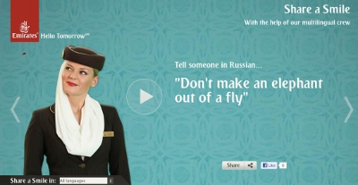 Attraverso clip video di 15 secondi pensati per far sorridere, l’equipaggio multilingue di Emirates spiegherà il significato di frasi popolari e modi di dire come”Don't make an elephant out of a fly” (Russo), “You're so pretty it made a bang” (cantonese) e “You're the cat's whiskers” (inglese). Ci sarà anche una compilation di immagini registrate “dietro le quinte” che mostrano il divertimento dell'equipaggio durante la realizzazione dei filmati.