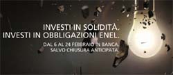'Investi in solidità. Investi in obbligazioni Enel' è il claim ideato dall'agenzia per comunicare l’emissione del prestito obbligazionario della grande azienda energetica italiana. Prevista una campagna integrata articolata su tv, radio, stampa, affissione e web, in pianificazione a partire dal 5 febbraio. Direzione creativa di Agostino Toscana e Alessandro Orlandi.