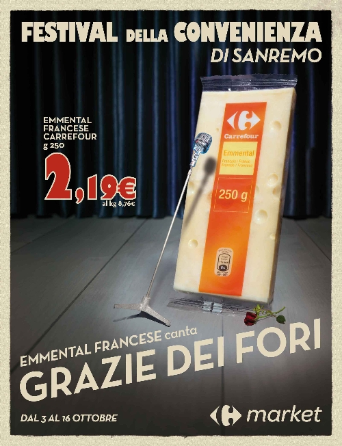 La campagna, ideata dall’art director Matteo Sozzi e il copywriter Giovanni Adamo, prende spunto dal legame indissolubile tra la città ligure e il festival della canzone per creare un meccanismo di comunicazione divertente che, nel presentare i prodotti a marchio Carrefour in sconto nei giorni dell’inaugurazione, fa il verso alla kermesse sanremese.