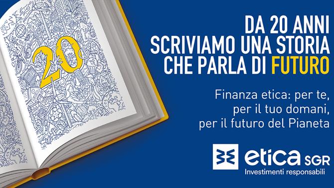 In occasione dei primi vent’anni dalla sua fondazione, Etica Sgr ha avviato una serie di iniziative, nel corso del 2020, pensate per celebrare la ricorrenza in modo speciale e ringraziare tutti i clienti che hanno riposto la propria fiducia nella società, contribuendo alla crescita del business. Lo spot TV evidenzia le caratteristiche aziendali legate sia all’esperienza maturata negli anni sia alla capacità di guardare al futuro, proponendo delle soluzioni di investimento per il risparmio personale che prendono in considerazione temi ambientali, sociali e di governance.