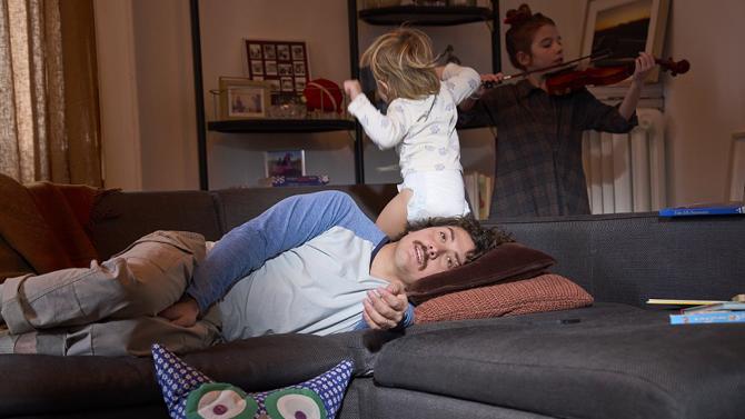 La scena principale si svolge sul divano di casa dove il protagonista, sdraiato, è assorto nei suoi pensieri, e non si fa distrarre né dalla neonata che gli saltella sulla testa né dalla bambina che, accanto a lui, suona il violino. Il suo pensiero fisso è solo uno: 500 euro per l’assicurazione auto, 500 euro per l’assicurazione auto…