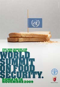 La campagna comunica l’importante appuntamento e offre una rappresentazione diretta e sintetica del problema che sarà affrontato: due fette di pane infilzate dalla tipica bandierina da sandwich su cui, però, il vessillo delle Nazioni Unite è issato a mezz’asta. La headline 'World Summit on Food Security. Per non morire più di fame nel mondo' riassume con efficacia l’impegno concreto della FAO nei confronti dell’emergenza fame.