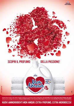 "Nei visual il profumo prende vita e si trasforma armonicamente in sensazione", prosegue Enrico Chiadò Rana, Direttore Creativo di Libera, "Miriadi di piccoli cuori di tessuto fuoriescono dal flacone di Mon Amour e si uniscono morbidamente per disegnare volti e figure umane, evocando l’Equilibrio, la Passione e la Freschezza. I key visual realizzati esprimono con intensità le caratteristiche del concept di prodotto, al centro del quale vi è una goduria polisensoriale estremizzata in ogni sua sfaccettatura: morbidezza, colore, tatto e naturalmente olfatto."