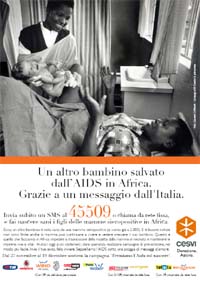 'Un altro bambino salvato dall’AIDS in Africa. Grazie a un messaggio dall’Italia' recita l’headline della campagna di comunicazione per la sensibilizzazione e la raccolta fondi tramite sms di Cesvi, organizzazione umanitaria impegnata dal 2001 nella lotta all’AIDS nell’Africa subsahariana con il progetto 'Fermiamo l’AIDS sul nascere' che compie dieci anni. Tramite l’sms solidale 45509, fino al 19 dicembre sarà possibile donare 2 euro.La campagna si declina sia online che offline. La campagna video ha la caratteristica di essere semplice e forte insieme. Poche immagini in bianco e nero, tratte dalle bellissime fotografie di Giovanni Diffidenti, elaborate con effetto 3D da Bondi Brothers, cucite dalla magia della voce di Lella Costa; nient'altro, niente musica, niente colore, se si eccettua un rettangolo arancione che va a identificare sulle fotografie quel particolare che fa tutta la differenza: una medicina, un vaccino, uno, due sorrisi pieni di gioia e di speranza. Sono questi i risultati che un donatore può ottenere con il solo gesto di inviare un sms, che diventerà aiuto concreto in Africa, dove il Cesvi è da anni impegnato a 'fermare l'AIDS sul nascere': impedendo il contagio tra il neonato e una mamma sieropositiva; e lottando per garantire anni e anni di vita attiva alle mamme malate.
