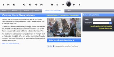 Anche quest'anno a pochi giorni dall'avvio dell'edizione 2012 del Cannes Lions International Festival of Creativity, The Gunn Report ha fatto un pronostico sui migliori spot in corsa per gli ambiti leoni stilando una classifica dei 20 più meritevoli di un metallo.