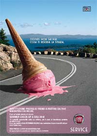Prima di partire per le vacanze, degli accurati controlli presso la rete di assistenza Fiat garantiscono più sicurezza a ogni viaggio. È con una campagna ironica, che utilizza come icona un’enorme cono gelato alla fragola, catapultato sulla carreggiata, che Fiat mette in guardia gli automobilisti dagli imprevisti che possono capitare.Come recita l’headline, infatti, D’estate non sai mai cosa ti riserva la strada. La creatività, che esce in affissione sulle principali autostrade italiane firmata da Fiat Service, verrà messa a disposizione anche dei mercati esteri e supportata da una campagna banner.