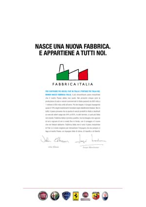 Oggi, 23 aprile, su tutte le testate nazionali, è on air un annuncio a firma di John Elkann e Sergio Marchionne che racconta a tutti gli italiani i progetti, i numeri che Fiat ha messo in cantiere per il nostro Paese. Per dare concretezza e valore alle scelte di Fiat, a questo piano è stato dato un nome, Fabbrica Italia, e anche un suo logo. Come è già successo altre volte nel corso degli ultimi anni Fiat sceglie di parlare direttamente ai cittadini e a tutte le parti sociali, di chiamare a raccolta tutte le forze del Paese per costruire un grande futuro. Per questo il titolo riprende l’espressione 'appartiene a tutti noi' che Marchionne stesso volle come chiusura del film manifesto che lanciò la 500 ormai tre anni fa .