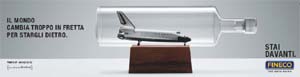 La campagna mostra un modellino di Shuttle come se fosse ormai un pezzo da collezione. Uno dei simboli della corsa allo spazio, infatti, viene messo dentro una bottiglia di vetro, di quelle comunemente usate per ospitare i velieri in miniatura. L’immagine è accompagnata dall’headline 'Il mondo cambia troppo in fretta per stargli dietro'. Un’idea forte racchiusa perfettamente nel pay off: 'Fineco. Stai davanti'.