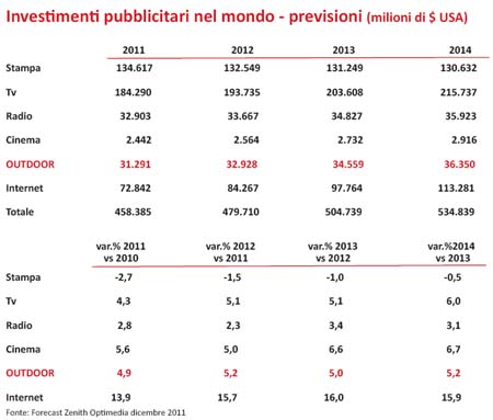 Le previsioni globali formulate in dicembre da Zenith Optimedia danno il mezzo in esterna in un costante incremento annuo intorno al 5% dal 2011 al 2014, secondo solo al web che viaggia con invcrementi a doppia cifra. Migliori le stime di Magnaglobal che prevedono una crescita dell’Outdoor a livello mondiale, nel quale si include anche il Cinema, pari al 6,4% nel 2011 e 6,3% nel 2012.