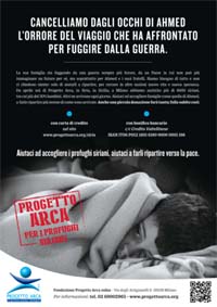 Fondazione Progetto Arca lancia in questi giorni una campagna di sensibilizzazione e raccolta fondi per l’Emergenza dei profughi siriani che ormai da ottobre scorso transitano dal nostro Paese, provenienti da mesi di fuga dalla guerra, e vengono accolti dalla città di Milano per poi procedere verso il nord Europa, dove cercheranno di ricostruirsi una nuova vita. La campagna di comunicazione, realizzata dall’agenzia di comunicazione, eventi e fund raising per il non profit Aragorn, è declinata in stampa, radio e web.