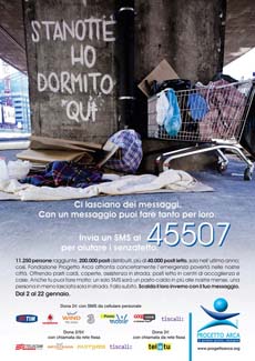 “Ci lasciano dei messaggi. Con un messaggio puoi fare tanto per loro” recita l’headline della campagna di comunicazione per la sensibilizzazione e la raccolta fondi tramite SMS solidale di Fondazione Progetto Arca, onlus che opera dal 1994 per offrire una risposta concreta ai bisogni sociali delle persone in stato di grave indigenza ed emarginazione. Tramite l’SMS solidale 45507, fino al 22 gennaio sarà possibile donare 2 euro. La campagna si declina sia online che offline. L'idea dello spot che supporta la campagna, nasce dall'osservazione semplice e immediata di quello che succede nelle nostre città. Ci sono tanti segnali che ci parlano della presenza dei senzatetto; solo che ogni tanto hanno bisogno di una traduzione. Perché non succeda che davanti a un cartone abbandonato, a dei rifiuti tirati fuori da un cestino, a un carrello della spesa colmo di malandati sacchetti di plastica e stracci sporchi, parli sempre e solo l'egoismo; che da questi segnali tende a trarre solo un senso di fastidio (la città sporca, i luoghi invasi, ecc.).