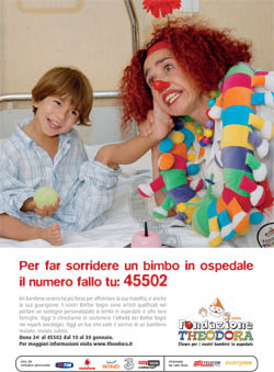 TBWA Italia ha firmato pro bono la nuova campagna di sensibilizzazione e raccolta fondi tramite sms solidale di Fondazione Theodora, la Onlus che porta un sorriso ai bambini ricoverati negli ospedali d'Italia attraverso i Dottor Sogni, clown professionisti specificatamente formati.Fino al 30 gennaio è possibile donare 2 euro inviando un SMS al numero 45502 da tutti i cellulari personali Tim, Vodafone, Wind, 3 e CoopVoce o chiamare da rete fissa Telecom Italia e Fastweb per sostenere il progetto 'Un sorriso per i piccoli malati di cancro' grazie al quale Fondazione Theodora vuole garantire la visita dei Dottor Sogni agli oltre 8.000 bambini ricoverati in ospedale.