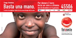 Negli ultimi 4 anni For A Smile Onlus ha portato acqua, cibo, salute e sviluppo a più di 10.000 bambini in tutto il mondo. Dal 2008 è in Congo per costruire il centro di accoglienza Talitha Cum in favore delle bambine di strada di Kinshasa. Anche quest’anno For a Smile Onlus realizzerà una campagna media di comunicazione sociale in supporto all’azione di fund raising tramite sms solidale 45506 con il quale si potranno donare 2 euro, dal 26 dicembre al 16 gennaio, inviando un sms o chiamando da Tim, Vodafone, Wind, H3G, CoopVoce, TeleTu e Telecom Italia.