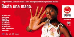 La nuova campagna è legata alla raccolta fondi in favore del progetto umanitario 'Talitha Cum' per la costruzione di un Centro di Accoglienza per bambine di strada a Kinshasa (Congo - RdC). Dal 21 dicembre 2009 al 9 gennaio 2010, si potrà donare 1 euro inviando un SMS al numero 48.5.84 o 2 euro chiamando da rete fissa Telecom Italia. La creatività è di Noodles Comunicazione.