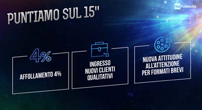 Altra importante novità punta a incentivare l’uso dei formati brevi (15”) (leggi news) di cui Piscopo ne ribadisce l'importanza strategica: "Sanremo ha avuto un tale successo pubblicitario grazie a questo nuovo approccio attraverso cui abbiamo frazionato gli spazi lavorando sul taglio da 15" e permettendo l'ingresso di molte realtà che altrimenti non avrebbero mai potuto presenziare nei palinsesti Rai". La quota dei 15” a Sanremo è passata dal 15% del 2014 al 30% del 2015.