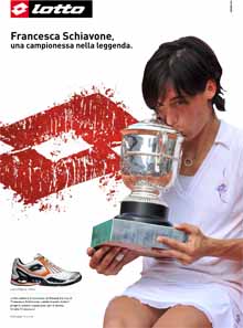Lotto Sport festeggia la storica vittoria al Roland Garros della sua testimonial Francesca Schiavone con una speciale pagina pubblicitaria firmata dall'agenzia Claim The Creative Box. 'Francesca Schiavone, una campionessa nella leggenda' è l'headline ideata da Claim per sottolineare l'eccezionale impresa ottenuta in terra parigina dalla tennista milanese, prima donna italiana ad aggiudicarsi un torneo del Grande Slam. Una campagna caratterizzata da un visual pulito ed elegante ma dal forte impatto emozionale, che mette in primissimo piano un'immagine di Francesca Schiavone mentre bacia il trofeo appena vinto. Al suo fianco la doppia losanga, il celebre marchio di Lotto, impressa sulla terra battuta del torneo francese. E proprio il marchio Lotto ricorda il bacio che la tennista, come in una sorta di rituale sportivo, ha lasciato sul terreno al termine di ogni incontro. In basso a sinistra un'immagine della scarpa Lotto Raptor Ultra, indossata dalla tennista durante il torneo, e una dedica speciale: “Lotto celebra il successo al Roland Garros di Francesca Schiavone, confermando tutto il proprio amore e passione per il tennis. Grazie Francesca!”.