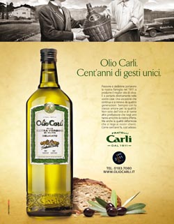 E’ partita con l’inizio dell’anno la campagna che celebra il centenario della Fratelli Carli rievocando lo spirito con cui l’azienda di Imperia ha iniziato e continua il proprio percorso. 'Cento anni di gesti unici' è l’headline del primo episodio della comunicazione che coprirà l’intero 2011. La fotografia di questo annuncio d’apertura ricostruisce il momento in cui la primissima damigiana viene idealmente consegnata da Giovanni Carli a uno dei suoi clienti.