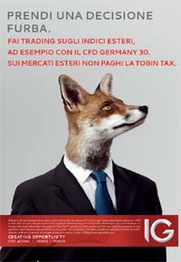 Partita la campagna multisoggetto 'Manimals' di Freccia Ambrosini Volpi per il cliente IG. Stampa quotidiana, con il Sole 24 Ore e Milano Finanza, e web i mezzi scelti per riposizionare il marchio inglese sul mercato italiano.Al primo soggetto sugli indici stranieri 'uomo volpe' seguiranno presto gli altri: uomo leone, uomo cobra, uomo ghepardo, uomo alligatore, uomo orso polare, uomo gufo e uomo aquila.