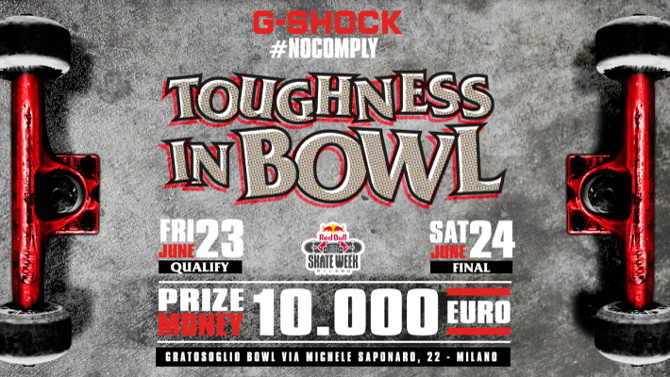 Il contest G-SHOCK #NoComply Toughness in bowl si articola in due giornate: venerdì 23 giugno le iscrizioni alle gare di qualifica sono aperte a tutti gli skaters presenti nella bowl; al termine della prima giornata la giuria ufficiale di professionisti selezionerà 10 wild card che insieme ai migliori riders della scena internazionale accorsi per l’evento si sfideranno il giorno sucessivo in una gara senza precedenti. La finale di sabato 24 giugno vedrà premiati 6 skaters in una classifica generale e due categorie speciali, il TOUGHEST TRICK – con cui G-SHOCK premierà il trick più duro e a prova di resistenza - e il TOUGHEST FALL – che vedrà invece primeggiare la caduta più estrema. Il montepremi totale in palio è di 10.000€.