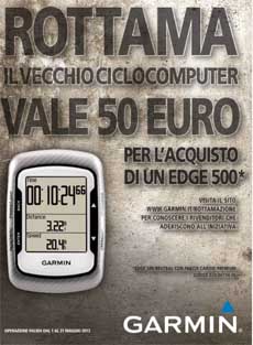 Non vi è ciclista che non abbia sul proprio manubrio un ciclo-computer, perché conoscere in tempo reale dati quali velocità e distanza percorsa è parte stessa dell’allenamento o della competizione. Tuttavia, mentre tutto (o quasi) il popolo dei cicloamatori ne possiede uno, non tutti hanno fatto il salto di qualità passando dal vecchio “computerino” ai più moderni e affidabili GPS da ciclismo. Ecco l’opportunità per rinnovare la propria attrezzatura adottando la tecnologia satellitare. Per tutto il mese di maggio 2013, Garmin sosterrà la propria campagna rottamazione che prevede uno sconto di 50,00 Euro sull’acquisto di un Edge 500 a fronte della restituzione del proprio ciclo computer, di qualsiasi marca, modello ed età.