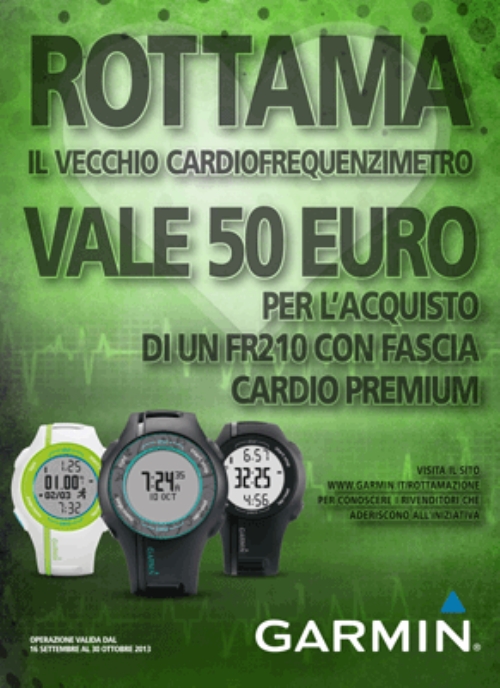 Da oggi, fino al 30 ottobre, Garmin Italia offre la possibilità di ‘rottamare’ il proprio vecchio cardiofrequenzimetro di qualsiasi produttore, sostituendolo con un nuovo Forerunner 210 ad un prezzo speciale. Un’occasione imperdibile per aggiornare la propria dotazione sportiva e rimettersi in forma con la migliore ‘tecnologia da polso’.