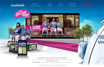 The Italian Trip. Raggiungere la meta non è mai stato così emozionante. Un claim immediato e semplice che con ironia mette in risalto le caratteristiche vincenti dei navigatori Garmin, capaci di portare alla 'meta' quattro giocatori rimasti indietro rispetto ai compagni di Nazionale. Il legame di Garmin con la Federazione Italiana Rugby è il fil rouge di questa campagna che si avvale, in qualità di attori protagonisti accanto ai prodotti di punta dell’azienda, quattro campioni della Nazionale: Martin Castrogiovanni, Fabio Ongaro, Tito Tebaldi e Leonardo Ghiraldini. Per la campagna sono stati individuati, come in una vera squadra di rugby, i ruoli più adatti ai navigatori satellitari Garmin, andando così a racchiudere l’intera line-up di prodotti: il nüvi 3760T- navigatore ultra- sottile e di design che racchiude il meglio della tecnologia Garmin, i nüvi 1440 e 1350, navigatori dalle alte prestazioni e un costo contenuto, il nüvi 1490TV, ottime capacità e visione di gioco per il navigatore con il digitale terrestre, il nüvi 1690, agilità e immediatezza per il primo navigatore connesso, il nüvi 465T, potenza di impatto per il primo navigatore con cartografia specifica per i mezzi pesanti e lo zümo 660, forza e dinamicità per il navigatore da moto più sottile e funzionale. Guarda il video