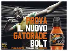 Sul sito Gatorade.it e alla pagina Facebook.com/GatoradeItalia è partito il gaming online denominato “Click and run” dedicato all’atletica e alla nuova special edition avente per protagonista il campione giamaicano. Il gioco consiste nel simulare una gara sui 100 metri piani cliccando il più velocemente possibile sulla tastiera del computer giocando contro gli “atleti” più veloci del web e contro i propri amici di Facebook. Dopo aver giocato l’utente potrà partecipare al concorso “Corri e vinci con Gatorade”, in palio 1 iPod shuffle al giorno e 10 iPod Touch con l'estrazione finale.Non mancherà la pianificazione televisiva su Rai e SKY SPORT dello spot a partire da sabato 14 maggio, adattamento dello spot internazionale finalizzato all’agenzia D’Adda, Lorenzini, Vigorelli, BBDO, che vede come protagonista l’uomo più veloce del mondo. Il filmato ritrae Usain Bolt nel tunnel d’ingresso che porta alla pista di atletica. Sono i momenti precedenti allo start. Gli avversari riscaldano i muscoli e cercano la massima concentrazione. Anche l’uomo più veloce della terra sta pensando alla gara che deve affrontare, alle sue continue sfide e all’arma in più che lo aiuta a battere gli avversari, il nuovo Gatorade Bolt.