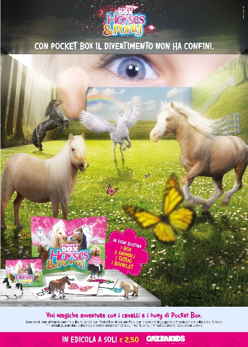 Due collezioni quindi, Horses&Pony per le bambine e Dino vs Dragon per i bambini, legate al mondo della fantasia , composte da 25 piccole fedeli riproduzioni 3D realizzate in materiale soft tpr e contenute in piccoli ‘Box-Tascabili’ (i Pocket Box appunto) che rappresentano rispettivamente il mondo incantato di cavalli e pony e il leggendario universo di draghi e dinosauri. Ogni bustina, in vendita in edicola a 2,50 euro, contiene due animali, un box, un tattoo e un booklet con la storia degli animali.