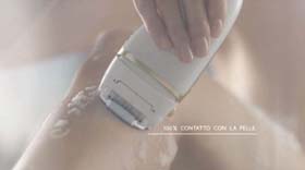 sorride mentre si depila; l’epilazione di Aquaperfect è delicata perché sfrutta il calore dell’acqua per dilatare i pori della pelle rendendo lo strappo più semplice e indolore.