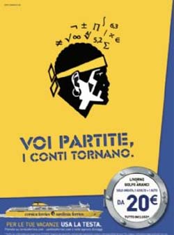 Negli spot per la tv la testa del moro-corso interagisce con gli spettatori parlando della convenienza dell'offerta del vettore, operante nel trasporto marittimo passeggeri verso le due grandi isole del Tirreno per le sue tariffe vantaggiose e l'elevata qualitò di servizio, unite a grande trasparenza nei confronti del consumatore.
