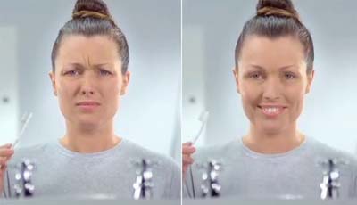 L’immagine che segue è quella che identifica immediatamente la differenza tra chi si prende cura delle proprie gengive e chi no. La nuova scena mostra due ragazze a confronto che si stanno spazzolando i denti: la prima, con un’espressione facciale corrucciata e infastidita, si accorge di avere le genigeve che sanguinano; la seconda, con un viso più sereno, sorride soddisfatta.