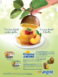 Il Consorzio Kiwigold detiene il brevetto per la produzione di Jingold, il kiwi a polpa gialla. Con l'obiettivo di creare nuove occasioni di consumo per i suoi frutti, il Consorzio ha creato Crème di Kiwi. Si tratta di un prodotto nuovo, ottenuto da kiwi gialli con l'aggiunta di pesca o pera. La lavorazione avviene con metodi naturali, utilizzando frutti freschi e non con purea, per ottenere una crema dalla consistenza semi-solida al cucchiaio. Il lancio del nuovo prodotto è stato affidato a Gruppo Atomix, che ha seguito tutti gli aspetti comunicativi del progetto a cominciare dall’indagine motivazionale e da un product test per poi occuparsi dell'ideazione del nome: Crème di Kiwi, chiaro, con un piacevole richiamo al francese.