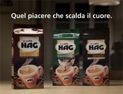 Sarà on air dal 25 dicembre il nuovo spot della marca di riferimento del decaffeinato che dà il via alla nuova strategia che mette in scena il consumo familiare e quotidiano di HAG. Nuovo anche il pay off, 'Quel piacere che scalda il cuore'. Il nuovo spot 30” sarà in onda inizialmente sui canali Mediaset. La regia è stata affidata a Luke Scott.