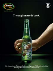 Heineken si conferma lo sponsor ufficiale di Halloween e torna con 700 feste organizzate in tutta Italia. E dopo 2 anni di assenza torna con il megaparty più esclusivo dell’anno: la festa, rigorosamente ad invito, è riservata ad ospiti selezionatissimi. Per celebrare il ritorno di Heineken Halloween Night, Heineken ha sviluppato una vera e propria piattaforma di comunicazione integrata in linea con il suo posizionamento legato all’entertainment. Il nuovo soggetto 'The nightmare is back' ideato da JWT - RMG Connect, è on air dall’11 ottobre su stampa sui principali free press, su promocard e affissione a Milano e Roma.