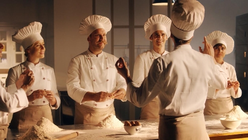 Sulle note di una musica originale che accompagna i loro gesti, l’orchestra dei pasticceri Bauli, guidati da un maestro, scandiscono le scene di preparazione del croissant, dall’impasto alla farcitura, per dar vita al croissant Bauli.